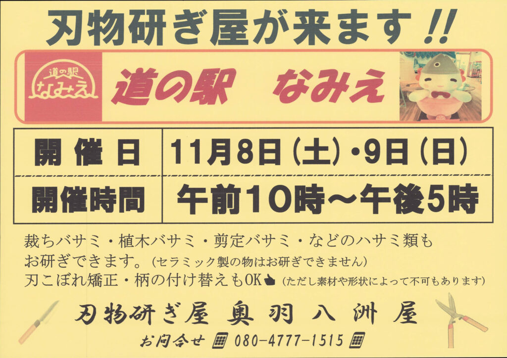 道の駅なみえに刃物研ぎ屋さんがやって来ます!