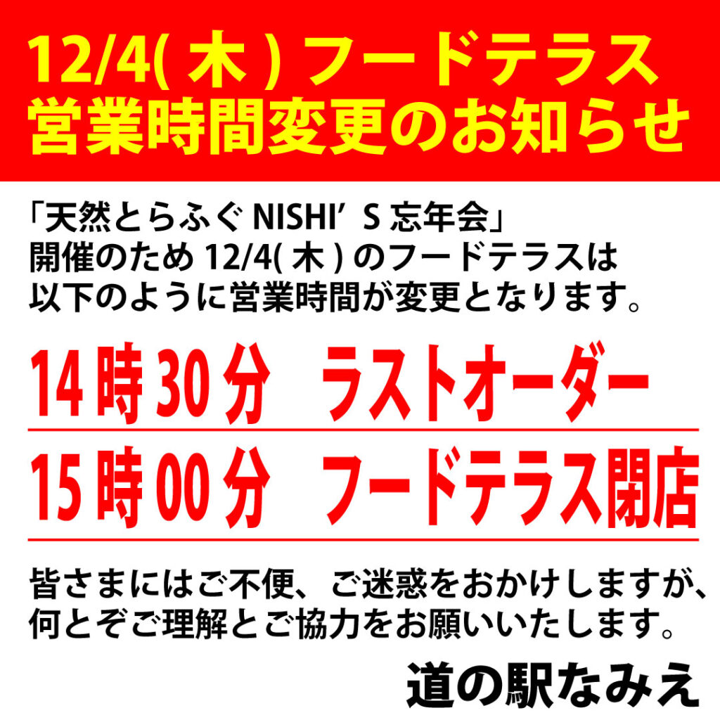 12/4(木)フードテラス営業時間変更のお知らせ